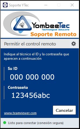 El soporte remoto de YombeeTec permite al técnico de YombeeTec ver la pantalla de su PC, MAC o dispositivo compatible desde otra ubicación y trabajar con su PC, MAC o dispositivo compatible a través de una conexión segura, utilizando tecnología de TeamViewer.